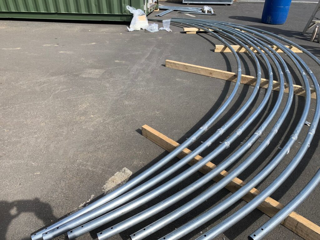 - After the purlins are installed, proceed to V bracing, V bracing is attached using the supplied nuts, bolts and clamps on all models 8m and above using the first and last shelter bays.