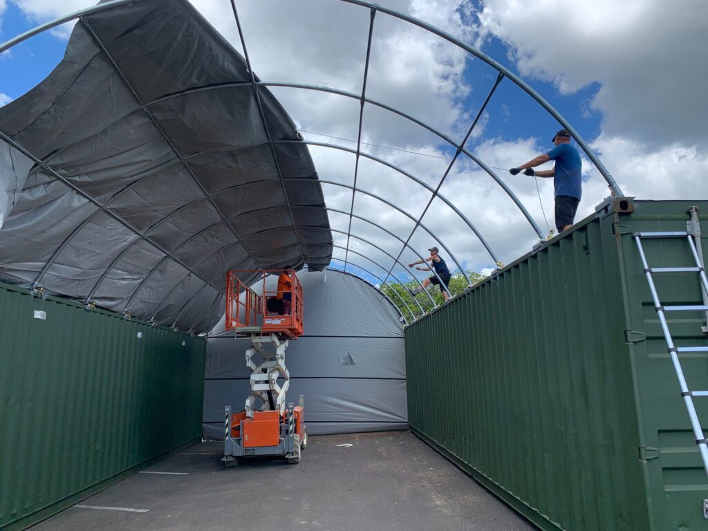- Prepare the overhead cover by unrolling it and laying it out along the full length atop of one container.