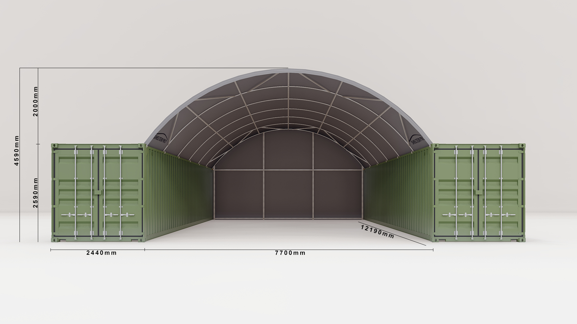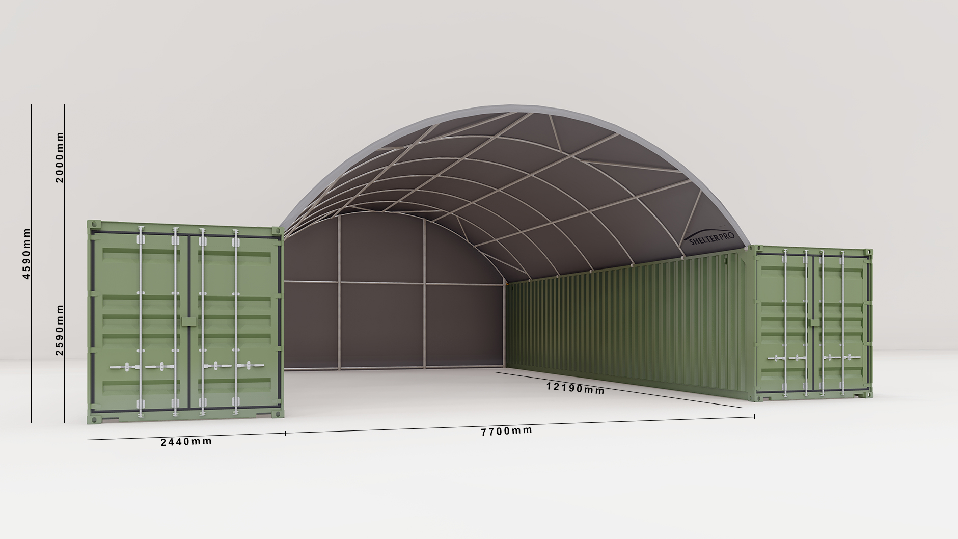 The SP840 Shelter has an arch height of 2m from container top or mounting point to apex. This makes for a total height of 4.59m on GP containers or 4.89m on HC containers.