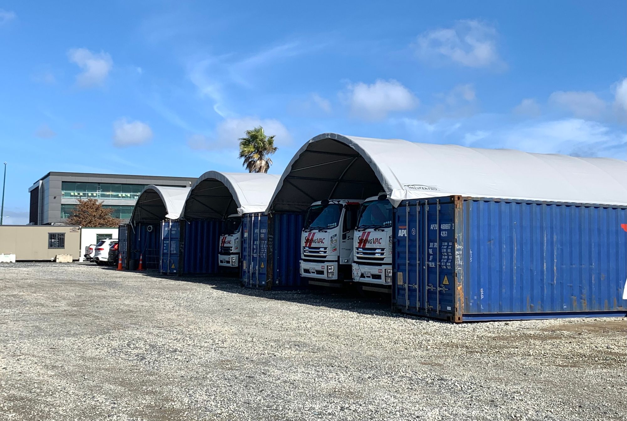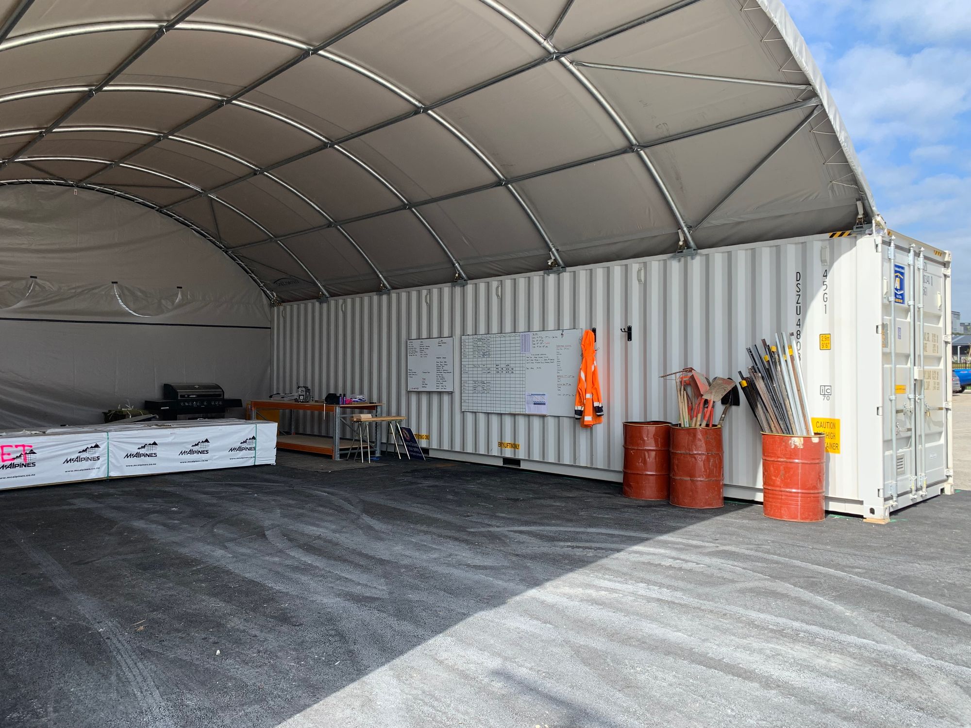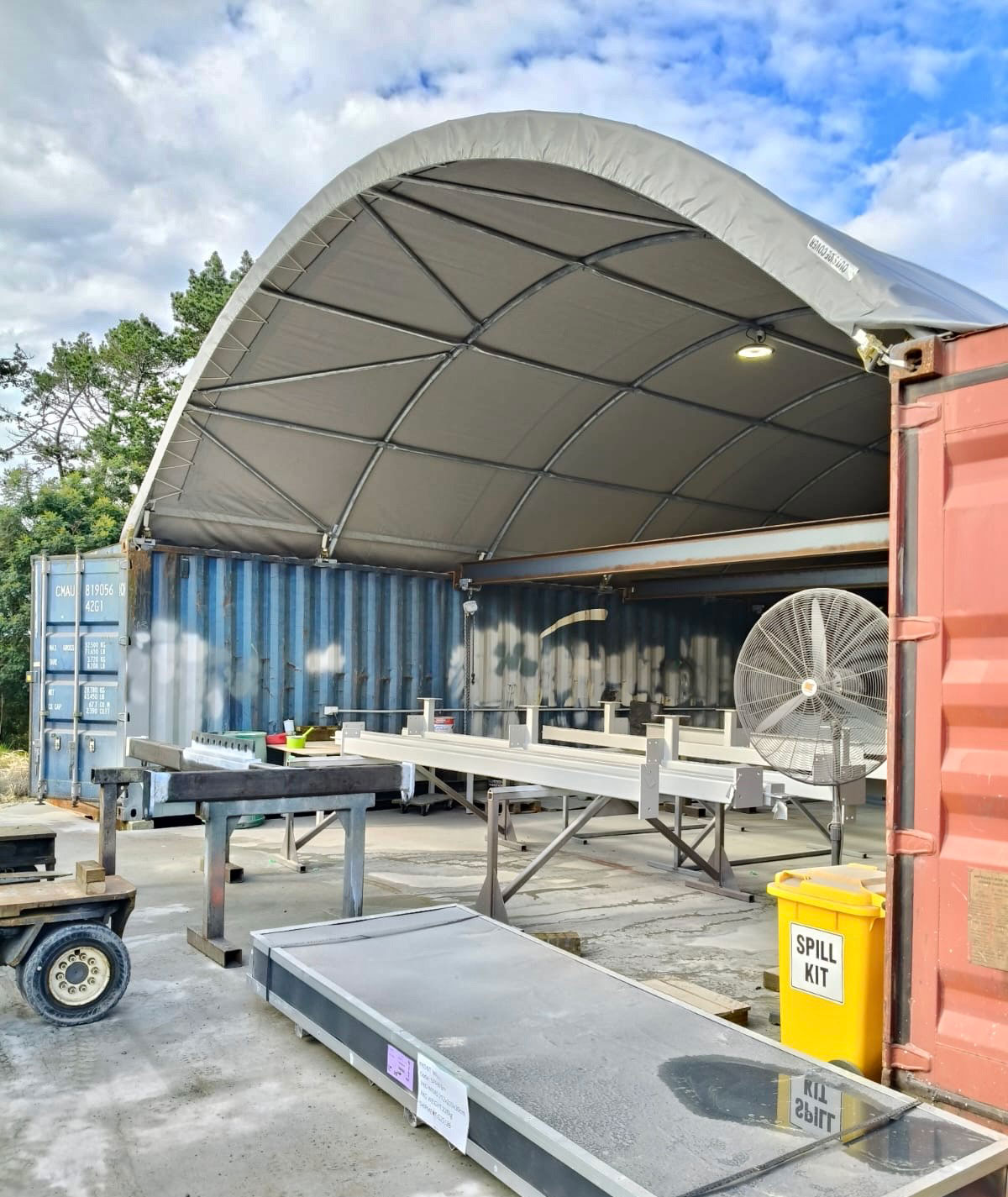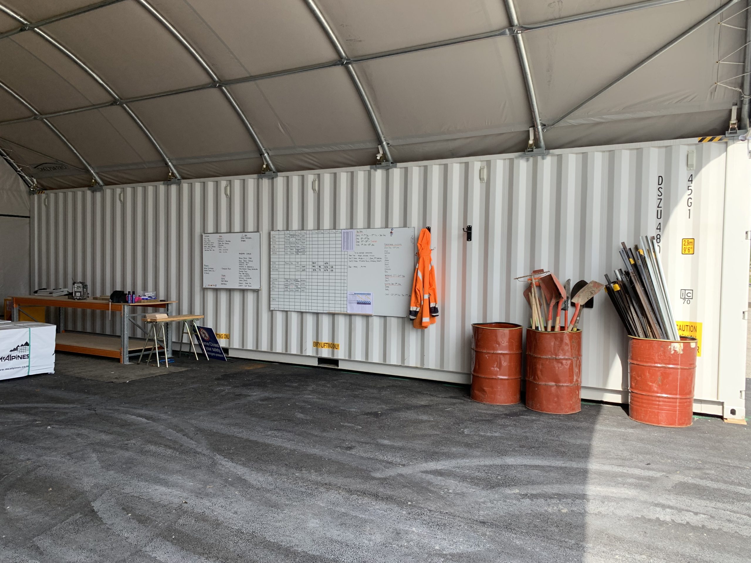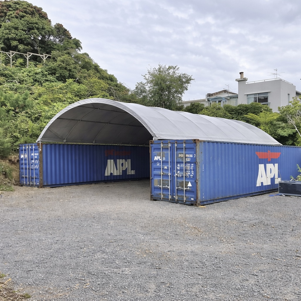 Designed for 40 foot containers set 7.70m apart our ShelterPro SP820 container shelter offers 93.86m² of covered protection. The ShelterPro SP840 frame has 7 arches, and 5 purlins made of super strong, hot dipped galvanised, rolled Q235 structural steel. We match these frames with our hard-wearing, UV stabilised, waterproof, fire retardant 610gsm PVC covers.